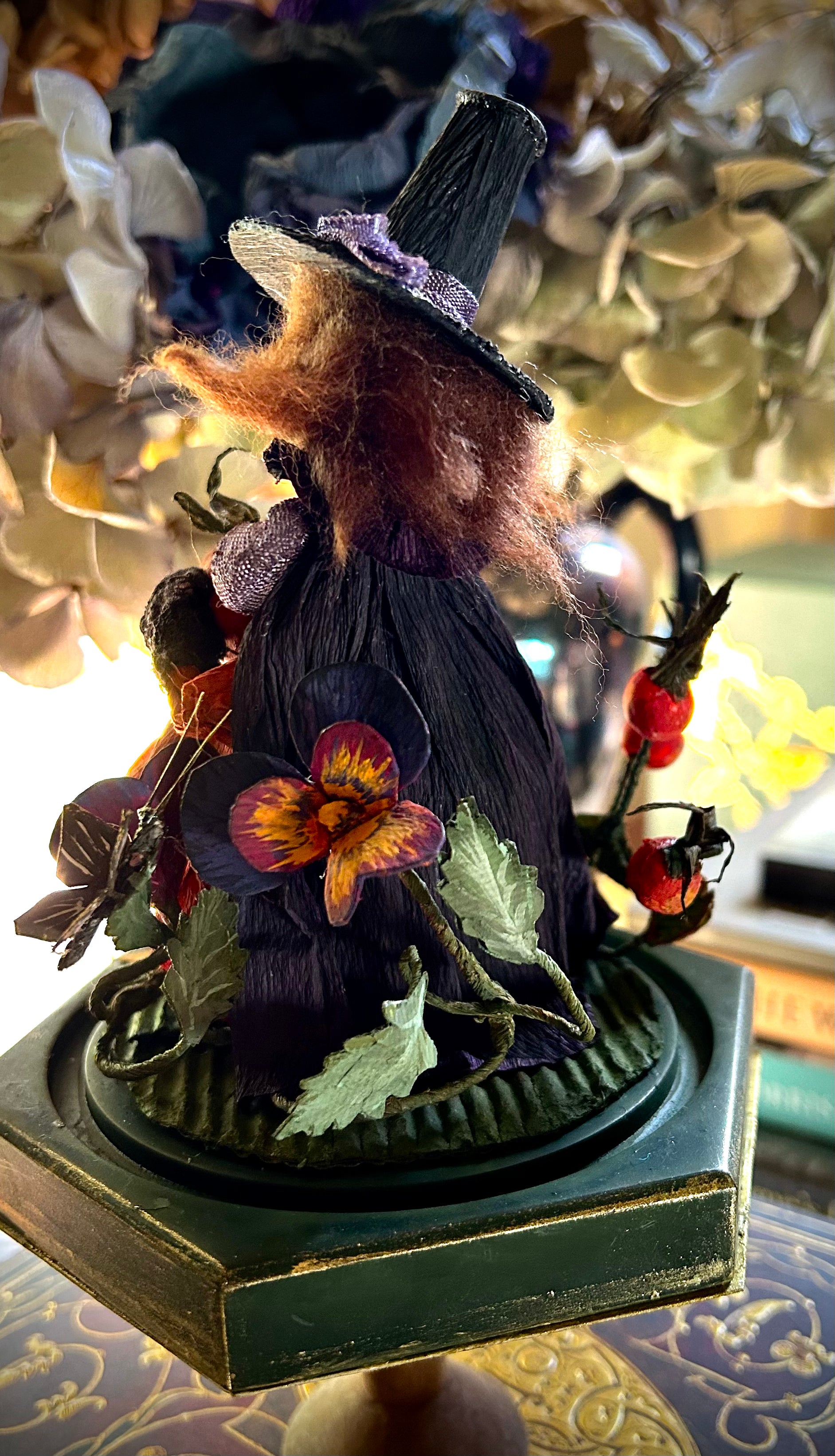 Expertly crafted from paper, Autumn Magic welcomes the season with whimsical charm. This dear little witch, surrounded by rosehips and pansies, is the perfect addition to your autumn decor. Enjoy the magic of autumn with this custom-made piece.