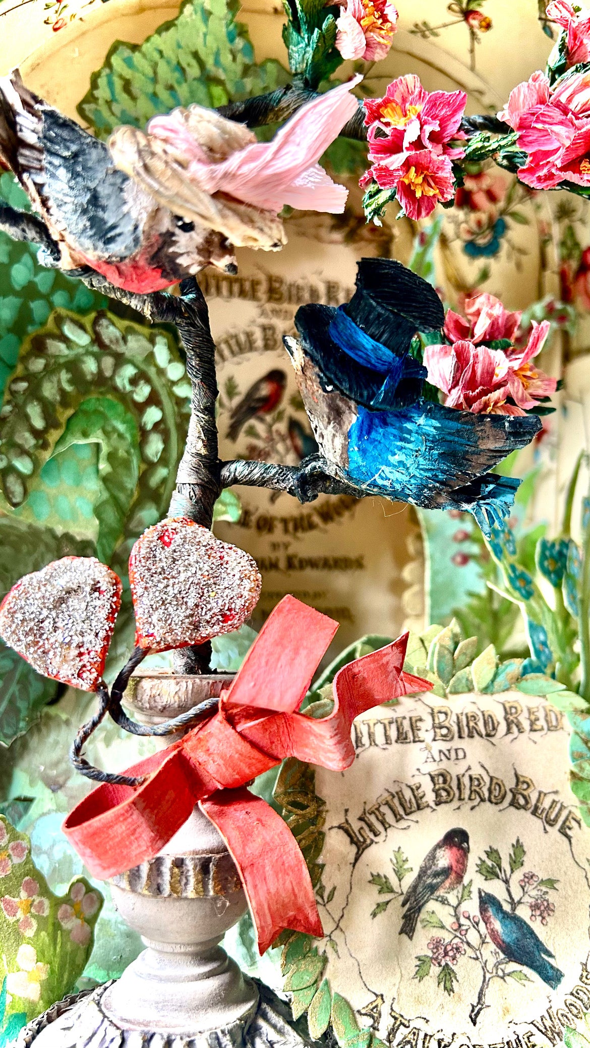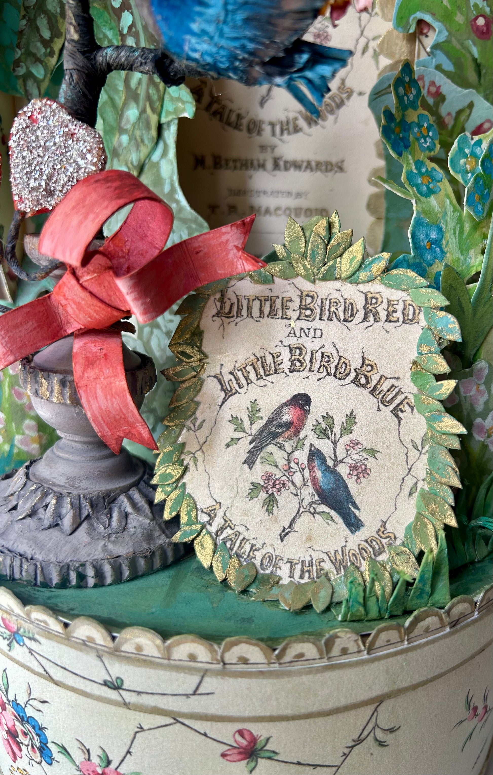 Observe the exquisite beauty of Little birds of the woods, featuring two hand-made paper birds in a pretty floral diorama. Marvel at the intricate details and vibrant colors as they sit in a forest, evoking a tale of nature. Crafted entirely from paper and paint, this piece is a must-have for any nature enthusiast.
