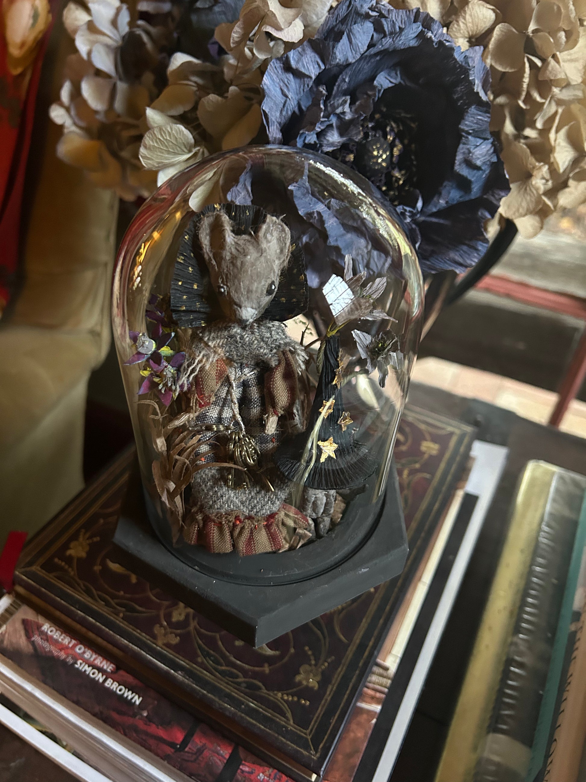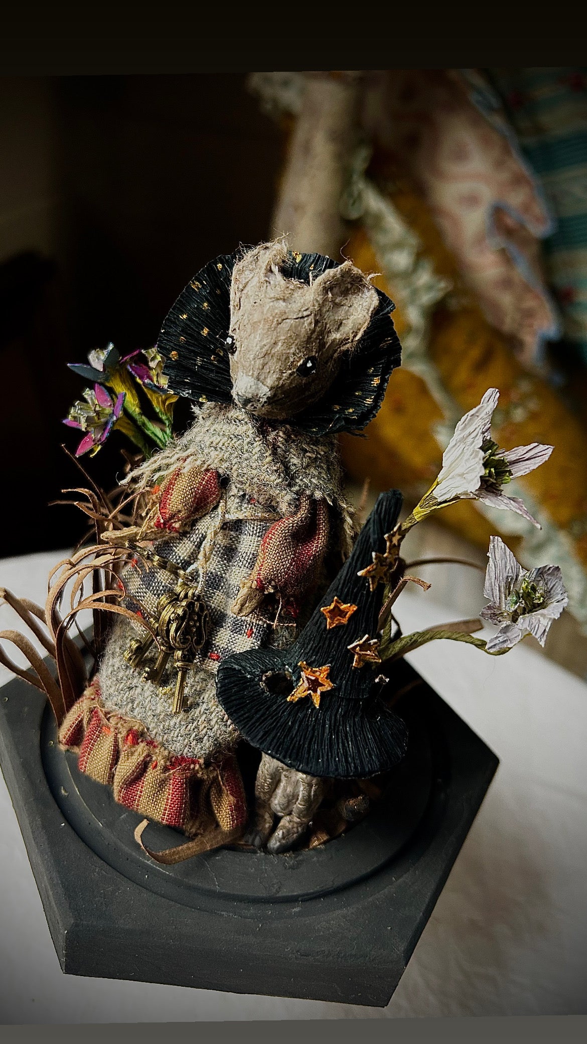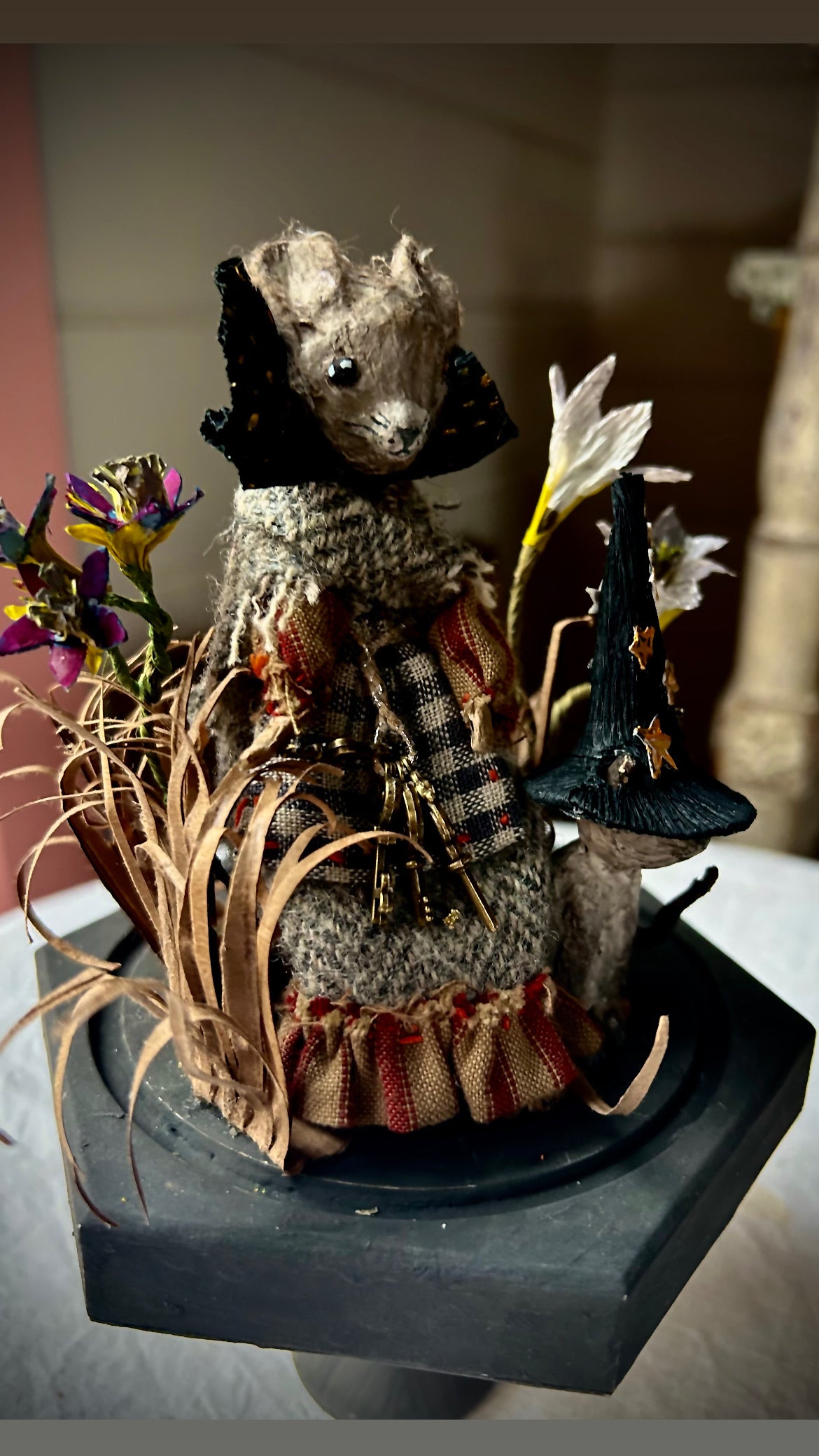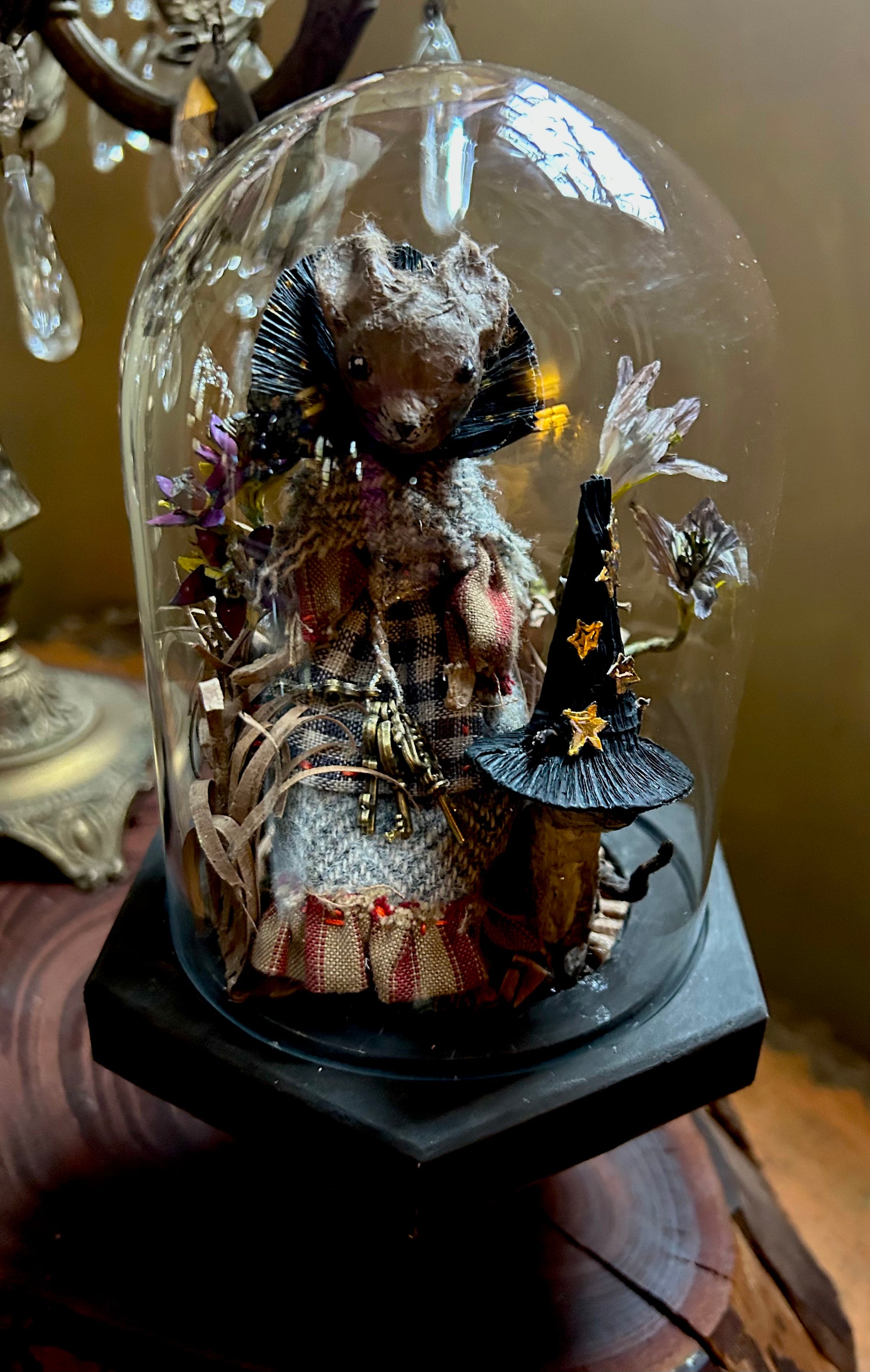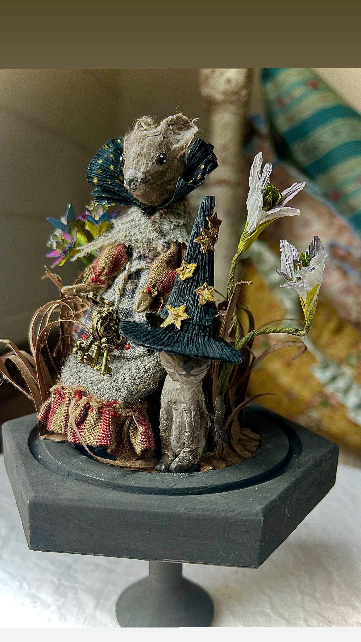 Meet Meena and Minou, two enchanting witches who sit atop their pedestal under a glass dome, surrounded by their magic. This handcrafted piece is made entirely from paper,