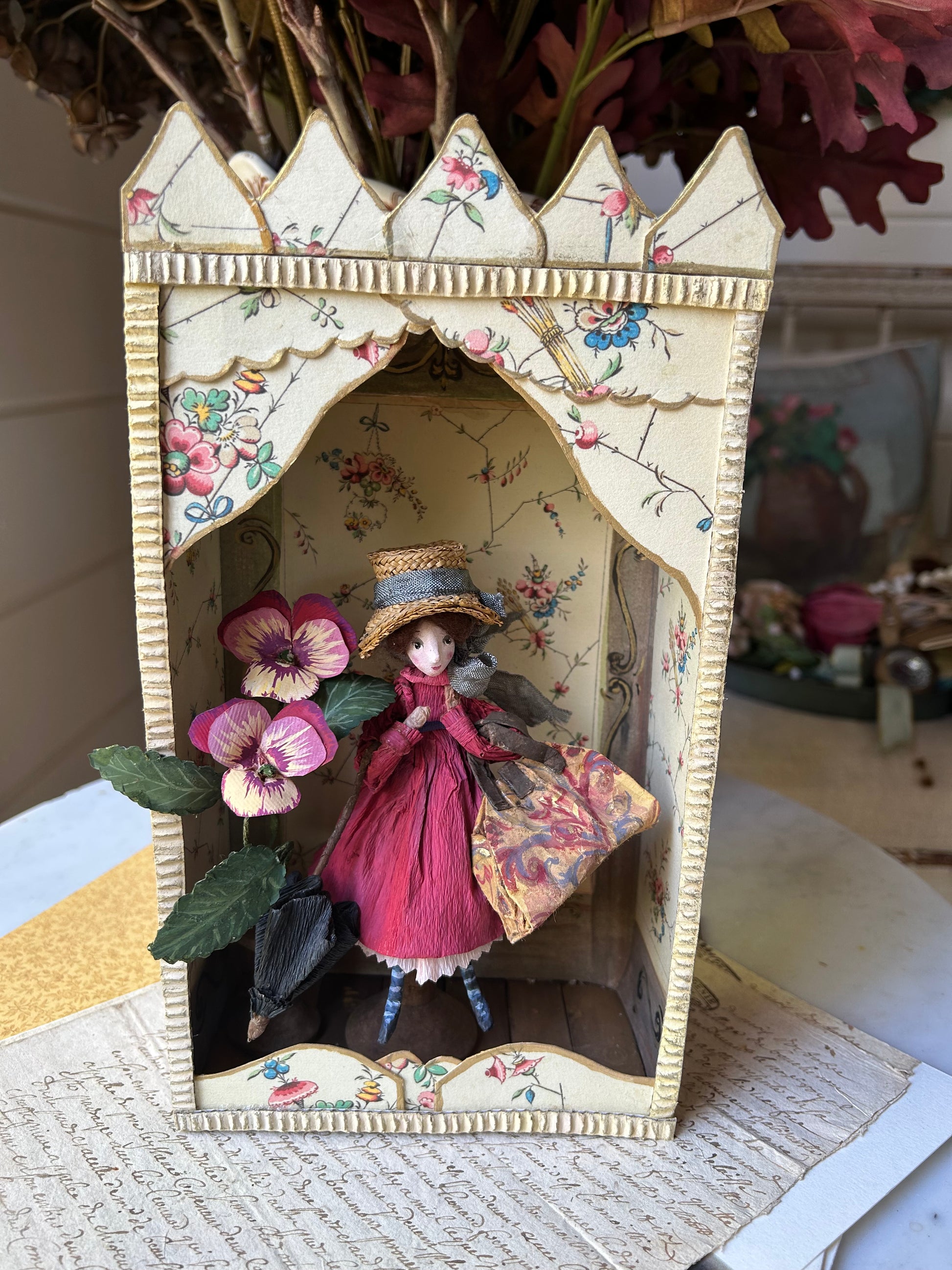 Discover the captivating world of Miss Poppins, a hand crafted paper mache doll accompanied by her iconic carpet bag and brolly. Complete with an exquisite gothic diorama, this charming piece stands at 27cm height and 15cm width with a 7.5cm diameter. A must-have for doll collectors and enthusiasts.